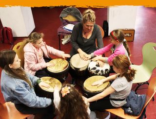 Two-day inter-disciplinary project in the Easter holidays with drumming, dance theatre and visual artwork for young people from age 5 to 16: at the ALISA Centre in Worms we set stories to music, improvise on various instruments and learn simple drum rhythms.