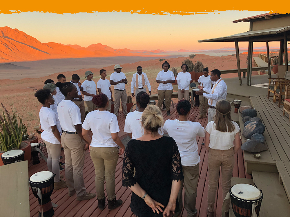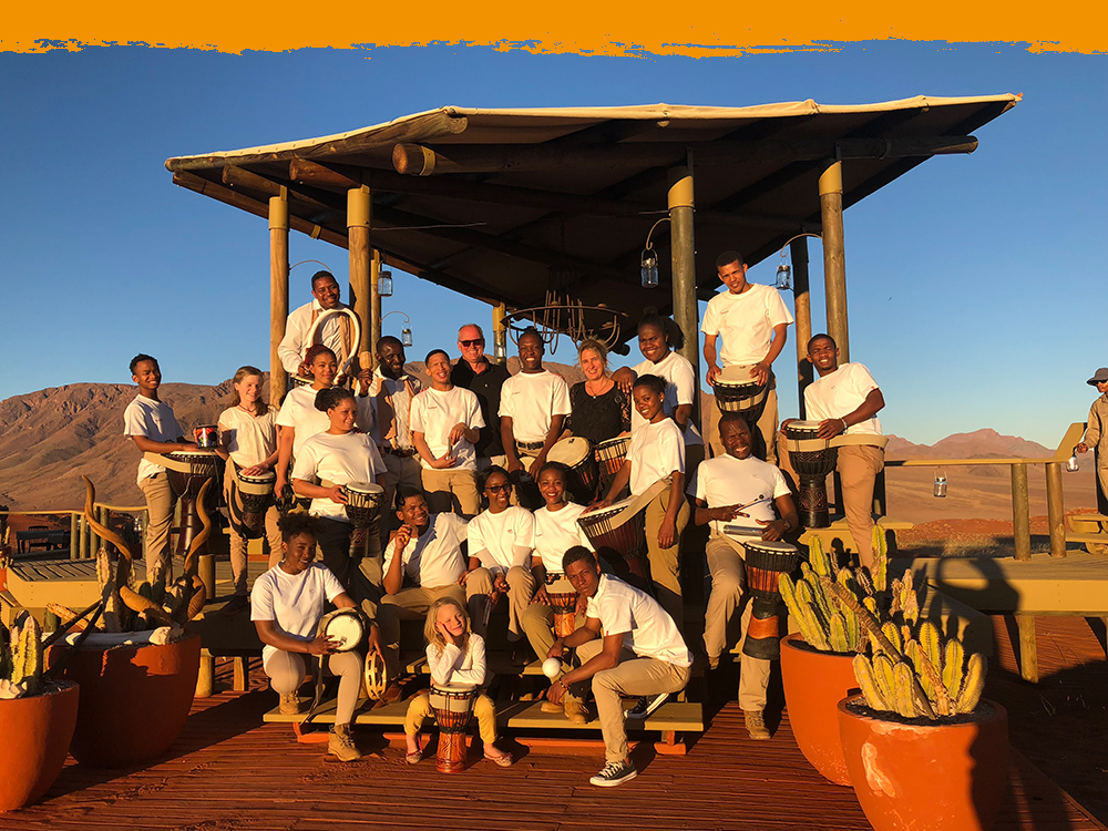 In the NamibRand Nature Reserve are located the four luxury lodges of the Wolwedans Collection. For four days we coach employees and trainees in drumming, musical improvisation, and choral singing – to prepare them for doing little performances for the guests. We practise a holistic style of coaching, which means that it includes personal development and the learning of various skills, including soft skills.
